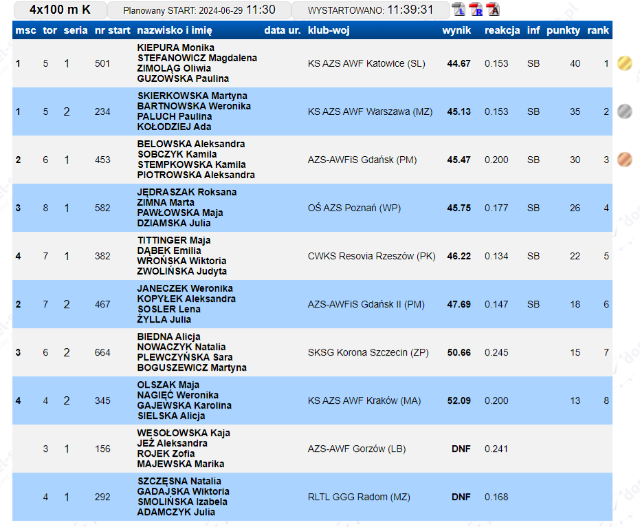 W końcowej klasyfikacji po złoto sięgnął KS AZS Katowice, srebro KS AZS AWF Warszawa i AZS AWFiS Gdańsk. W brązowej sztafecie pobiegły Aleksandra Belowska, Kamila Sobczyk, Kamila Stempkowska i Aleksandra Piotrowska. Przypomnijmy, że w piątek wychowanka Wdy Świecie w w biegu na 100 m kobiet zajęła 7. miejsce. Na pewno debiut w czempionacie seniorek może uznać za bardzo udany.