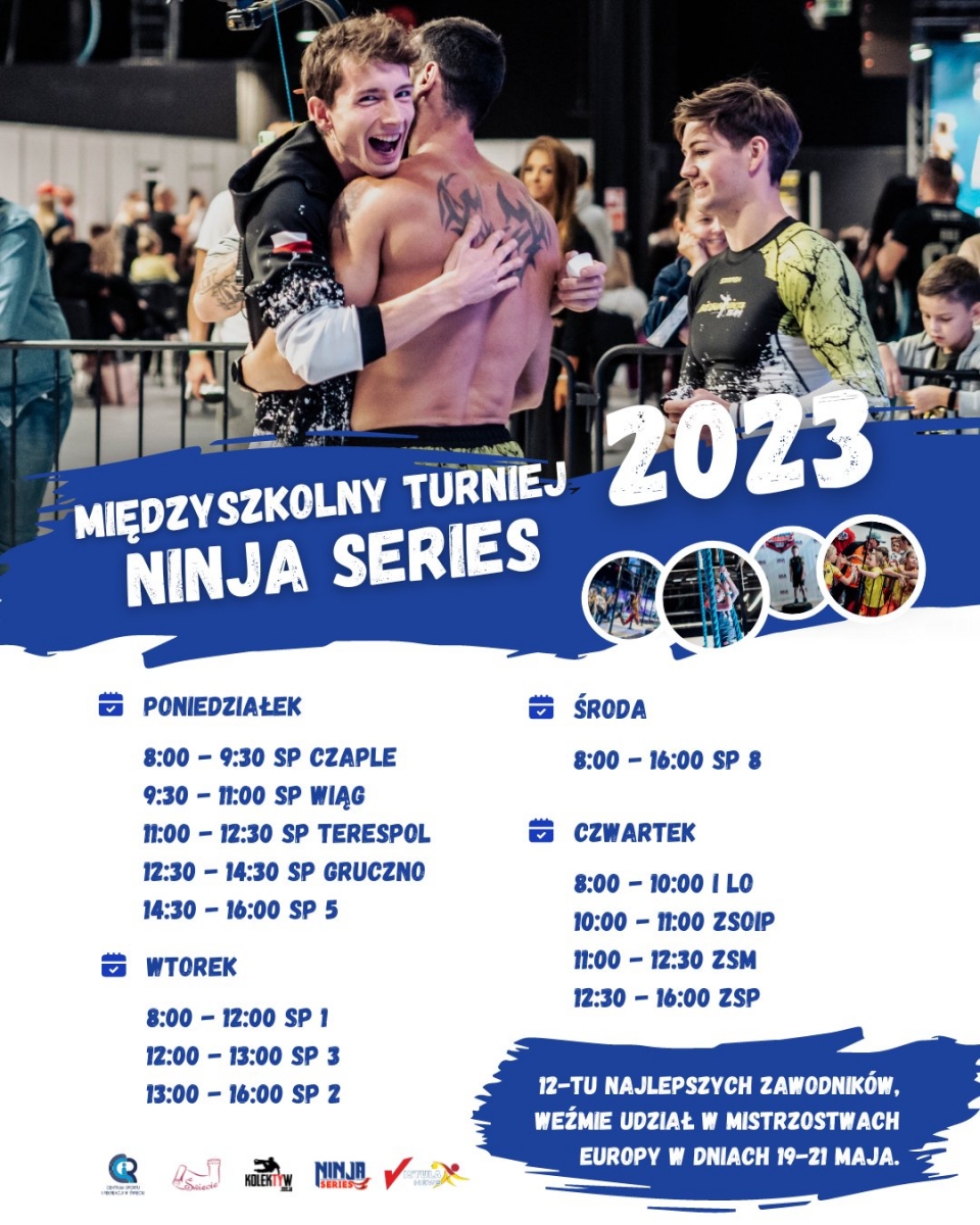 I to właśnie najmłodsi będą mieli okazje jako pierwsi poczuć smak rywalizacji. Od poniedziałku rusza Międzyszkolny Turniej Ninja Series ‘2023. Zgłosiło się do niego 13 szkół z gminy Świecie (ponad 2500 zawodników). Do środy rywalizować będą uczniowie szkół podstawowych, a czwartek będzie dla uczniów szkół średnich. Każda placówka będzie miała wyznaczone godziny (szczegóły na plakacie). 12 najlepszych awansuje do Pucharu Europy. Dla dzieci i młodzieży organizatorzy przewidzieli kategorie wiekowe, z podziałem na płeć: 7-8 lat, 9-10 lat, 11-12 lat, 13-14 lat, 15-16 lat, 17-18 lat.
