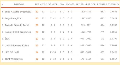 Inne wyniki 12. kolejki: Twarde Pierniki Toruń - Siódemka Kutno 97:37, TKM Włocławek - ŁKS KM Szkoła Gortata Łódź 79:101.