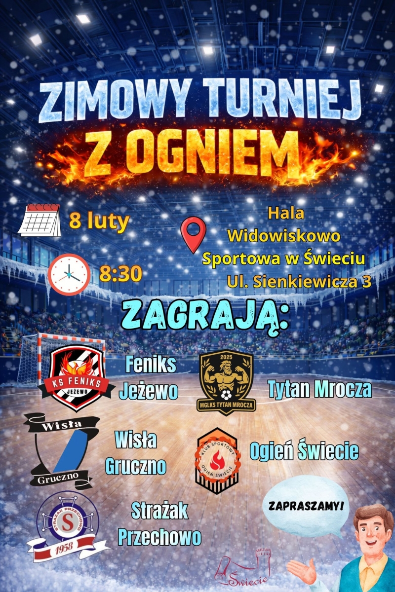 W niedzielę w hali widowiskowo-sportowej w Świeciu odbędzie się Zimowy Turniej z Ogniem dla rocznika 2010 i młodsi. Zagrają: Ogień Świecie, Strażak Przechowo, Feniks Jeżewo, Wisła Gruczno i Tytan Mrocza. Początek rywalizacji o godz. 8.30.