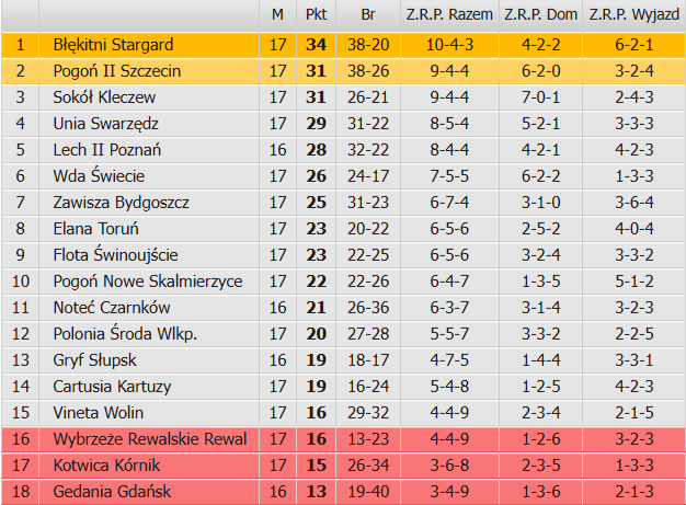 Mistrzostwo jesieni grupy 2. przyklepali w sobotni wieczór w Słupsku piłkarze Błękitnych Stargard wygrywając z Gryfem 3:2 (1:0). Na 2. miejsce wskoczyły rezerwy Pogoni Szczecin, które tracą do lidera trzy „oczka” podobnie jak Sokół. Dołączyć do nich może jeszcze Lech II Poznań, który mecz tej kolejki z Gedanią Gdańsk rozegra dopiero 30 listopada. Został on przełożony z uwagi na powołania Lechitów do młodzieżowych reprezentacji narodowych. Do rozegrania pozostaje też mecz z 16. kolejki Noteć Czarnków – Gryf Słupsk, które odbędzie się w najbliższą środę.