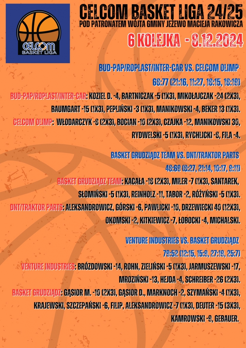 DNT/Traktor-Parts, Celcom Olimp Jeżewo i Venture Industries Grudziądz wygrywali w 6. kolejce CLB w Jeżewie. To oznacza, że czołowa trójka powiększyła przewagę. Tym razem emocje były mniejsze niż tydzień wcześniej, a wyniki rozstrzygały się już po trzecich kwartach. Aktorem nr 1 niedzieli był Karol Drzewiecki, który rzucił dla lidera DNT/Traktor-Parts aż 40 pkt, w tym 12 „trójek”. „Traktorzyści” pokonali drugi raz w tym sezonie Basket Grudziądz Team 69:48. Wynik ustawiła 1. kwarta wygrana 27:8. Trwa dobra passa jeżewian, którzy zrewanżowali się Bud-Pap/Roplast/Inter-Car za porażkę na inaugurację sezonu 60:62. Wygrali 77:68. Kluczowa okazała się 2. kwarta, którą Olimp wygrał 27:11 odrabiając z nawiązką pięć „oczek” straty z inauguracyjnej odsłony.