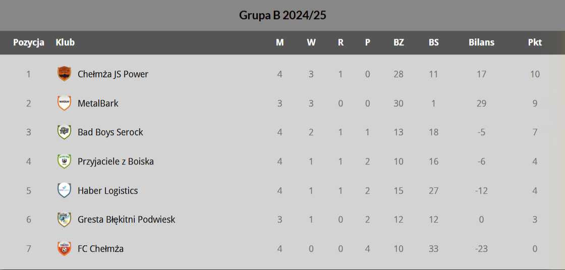 Grupa „B” – 4. kolejka: FC Chełmża – MetalBark Bydgoszcz 0:9 (0:2) - Radosław Zużydło 2, Ireneusz Rżany 2, Michał Konwiński 2, Wojciech Konwiński, Tomasz Ejankowski, Adam Kacprzak (M); Chełmża Futsal Team JS Power – Haber Logistics 10:4 (4:1) - Kacper Rybacki 3, Marcin Trzoski 2, Bartosz Łubkowski 2, Sebastian Kępiński 2, Jakub Soszka (ChFT), Dawid Murawski 2, Krzysztof Piątkowski, Mateusz Szymecki (HL); Bad Boys Serock – Przyjaciele z Boiska Bysław 1:0 (0:0) - Jakub Cielepak (BB). Pauza: Gresta/Błękitni Podwiesk.