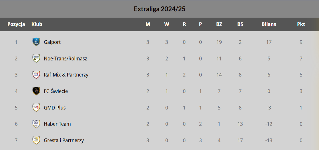 Extraliga – 3. kolejka: Gresta i Partnerzy – Galport Świecie 2:8 (1:4) - Mikołaj Topór 2 (Gresta), Maciej Śliwiński 3, Damian Stasikowski 2, Kacper Tarkowski 2 (1 – rzut karny przedłużony), Kacper Piór (G); Haber Team – Raf-Mix & Partnerzy 1:7 (0:4) - Przemysław Modrzyński (HT), Maciej Sieradzki 3, Marcin Wanat 2, Dawid Kawka 2 (RM); Noe-Trans/Rolmasz Przysiersk – GMD Plus 5:2 (4:0) - Amadeusz Olszewski 2, Bartosz Rybiński 2, Tomasz Wiśniewski (NT). Pauza: FC Świecie.