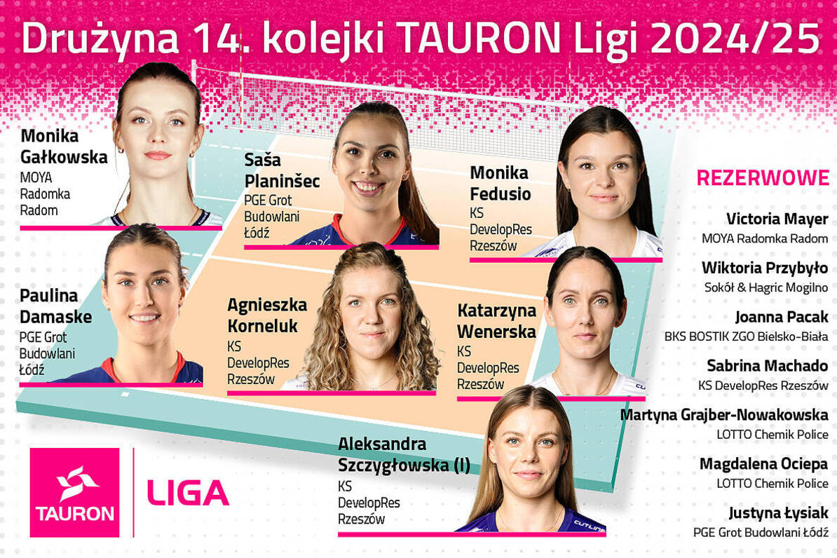 KS Developres Rzeszów zdominował „drużynę 14. kolejki”, bo oprócz Kasi Wenerskiej w jej wyjściowym składzie znalazły się także środkowa Agnieszka Korneluk, przyjmująca Monika Fedusio i libero Aleksandra Szczygłowska. Z kolei rezerwową atakującą wybrano Sabrinę Machado. Drugą rozgrywającą tej kolejki została Weronika Mayer z Radomki Radom. Kibicom ze Świecia przypomina się Magdalena Ociepa, która obecnie reprezentuje barwy Chemika Police. Tą wskazano jako rezerwową środkową bloku.