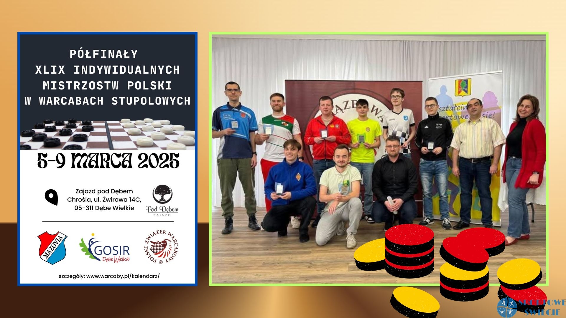 Dominik Rubaj i Leszek Napiontek (obaj SIN Razem Świecie) w dniach 5-9 marca grali w półfinale Mistrzostw Polski Seniorów w warcabach stupolowych. Zawody rozegrano w Chrośli w dwóch grupach, a awans uzyskiwało po czterech najlepszych zawodników z każdej. Dominik Rubaj rywalizował w grupie „A” z 17 innymi zawodnikami. Po 7 rundach trzech warcabistów zgromadziło po 10 punktów. O kolejności decydowała punktacja pomocnicza MSolk. Ostatecznie pierwszy był Karol Dutkiewicz (LKS Olymp Błonie), drugi Dominik Rubaj, zaś trzeci Sebastian Wieczorek (LKS Czarna Damka Lututów). Z 4. miejsca awansował Kamil Flisikowski (SRW Rychlik) – 9 pkt. Dodajmy, że świecianin trzy partie wygrał, a pozostałe zremisował. Uczeń I LO Świecie po raz czwarty zagra w czempionacie seniorów.