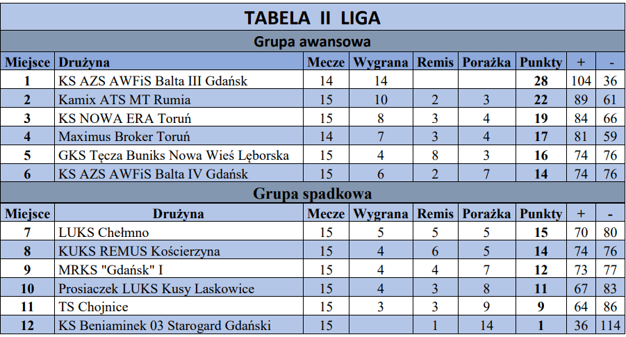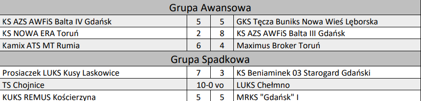 Kusy umocnił się na 10. miejscu z dorobkiem 11 pkt. Może jeszcze wyprzedzić MRKS I Gdańsk o ile wygra swój ostatni mecz z LUKS Chełmno, a gdańszczanie przegrają w Starogardzie Gdańskim. Już wiadomo, że w II lidze będzie trzeba zwolnić trzy miejsca, bo wczoraj z I ligi definitywnie został zdegradowany AZS AWFiS II Gdańsk. Co ciekawe, najlepszym drugoligowcem został AZS AWFiS III Gdańsk, który powalczy o awans w barażach.