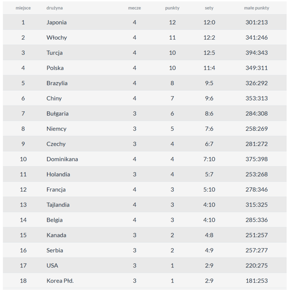 Po pierwszych turniejach (były trzy) Polska zajmuje 4. miejsce z 10 pkt. Przypomnijmy, że z uwagi na to, że finał Ligi Narodów odbędzie się w Łodzi nasza reprezentacja ma zapewniony w nim udział bez względu na wynik. Pierwszy liderem rankingu VNL jest Japonia, która jako jedyna nie straciła punktu w czterech rozegranych meczach.