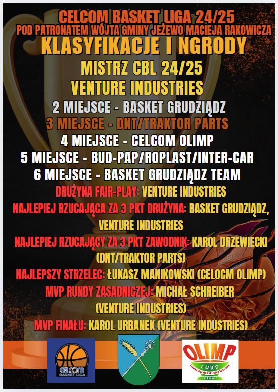 Venture Industries Grudziądz odkąd pojawiło się w 2019 roku w Celcom Basket Lidze w Jeżewie zawsze kończy rozgrywki jako mistrz. Tradycja podtrzymana została w niedzielę, a grudziądzanie sięgnęli w sumie po czwarty tytuł. W drugim meczu finałowym Venture Industries pokonało Basket Grudziądz 75:52 (25:7, 12:13, 22:15, 16:17). Obrońca mistrzowskiego tytułu miał przed rewanżem 12 pkt przewagi, bo 13 kwietnia w pierwszym spotkaniu wygrał 67:55. Koszykarze Venture Industries prowadzili od początku 9:0, 12:4, 22:4, 28:9, 33:12 i 35:14. Do przerwy mieli 17 „oczek” zaliczki (37:20). W 3. kwarcie najpierw Basket Team zbliżył się na 14 pkt, lecz potem znów tracił 20 „oczek” (25:45, 32:52), a po pół godziny gry już 26 (33:59). W ostatniej kwarcie faworyci kontrolowali wydarzenia na boisku (59:37, 67:43, 73:43), by zwyciężyć różnicą 23 pkt, a w całym finale 35. Najwięcej punktów dla Venture Industries w niedzielę rzucili: Karol Urbanek – 19 (3), Michał Schreiber – 19 (2) i Adam Jarmuszewski – 14, zaś dla Basketu Mateusz Deuter – 18 (3).