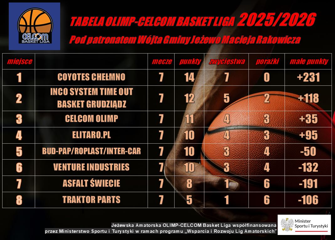 Niedziela: Celcom Olimp – Elitaro.pl (9), Bud-Pap/Roplast/Inter-Car – Venture Industries (10), Asfalt – Basket (11), Traktor-Parts – Coyotes (12). Mecze w hali sportowej w Jeżewie.