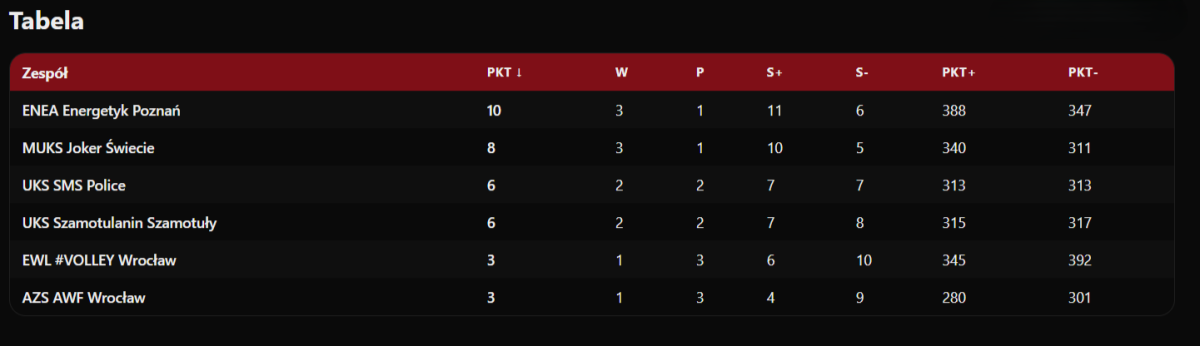 Wyniki: Joker Świecie – UKS SMS Police 3:0 (25:21, 25:23, 25:17), Szamotulanin Szamotuły – AZS AWF Wrocław 0:3 (20:25, 10:25, 19:25), Enea Energetyk Poznań – Joker Świecie 2:3 (25:22, 23:25, 25:23, 19:25, 12:15) UKS SMS Police - #VolleyWrocław 3:1 (19:25, 26:24, 25:16, 25:22), AZS AWF Wrocław - #VolleyWrocław 1:3 (25:23, 29:31, 23:25, 26:28), Szamotulanin Szamotuły – Enea Energetyk Poznań 1:3 (16:25, 23:25, 25:18, 14:25).