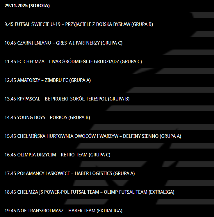 Program turnieju: Juventus Toruń - FC Toruń (godz. 16.30), FC Toruń - Futsal Świecie (17.10), Włókniarz Toruń - Futsal Świecie (17.50), Juventus Toruń - Włókniarz Toruń (18.30), Futsal Świecie - Juventus Toruń (19.10), Włókniarz Toruń - FC Toruń (19.50).