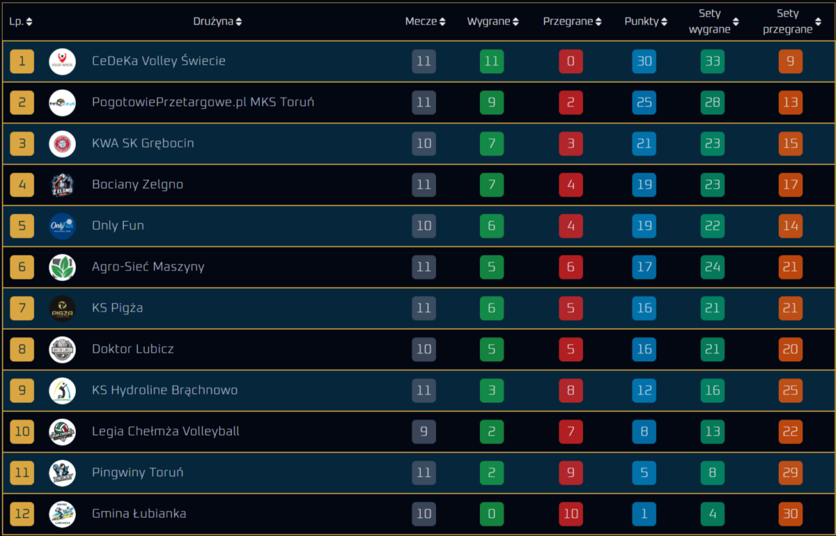 Siatkarze i siatkarki CeDeKa Volley Świecie znakomicie grają w Amatorskiej Ligi Siatkówki z siedzibą w Brąchnowie. Pod koniec października informowaliśmy o ich pięciu zwycięstwach na starcie drugiego dla nich sezonu w tych rozgrywkach. W następnych sześciu meczach drużyna Tomasza Kołodzieja potwierdziła dobrą formę. Wygrała je, w tym dwa po tie-breakach. W sumie w 11 spotkaniach świecianie zdobyli 30 pkt na 33 możliwe. Na półmetku mieli pięć „oczek” przewagi nad Pogotowie Przetargowe.pl MKS Toruń i dziewięć nad KWA SK Grębocin (jeden mecz zaległy).