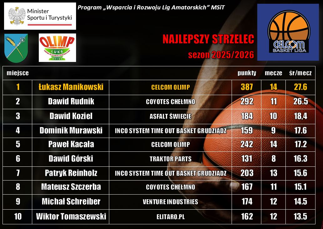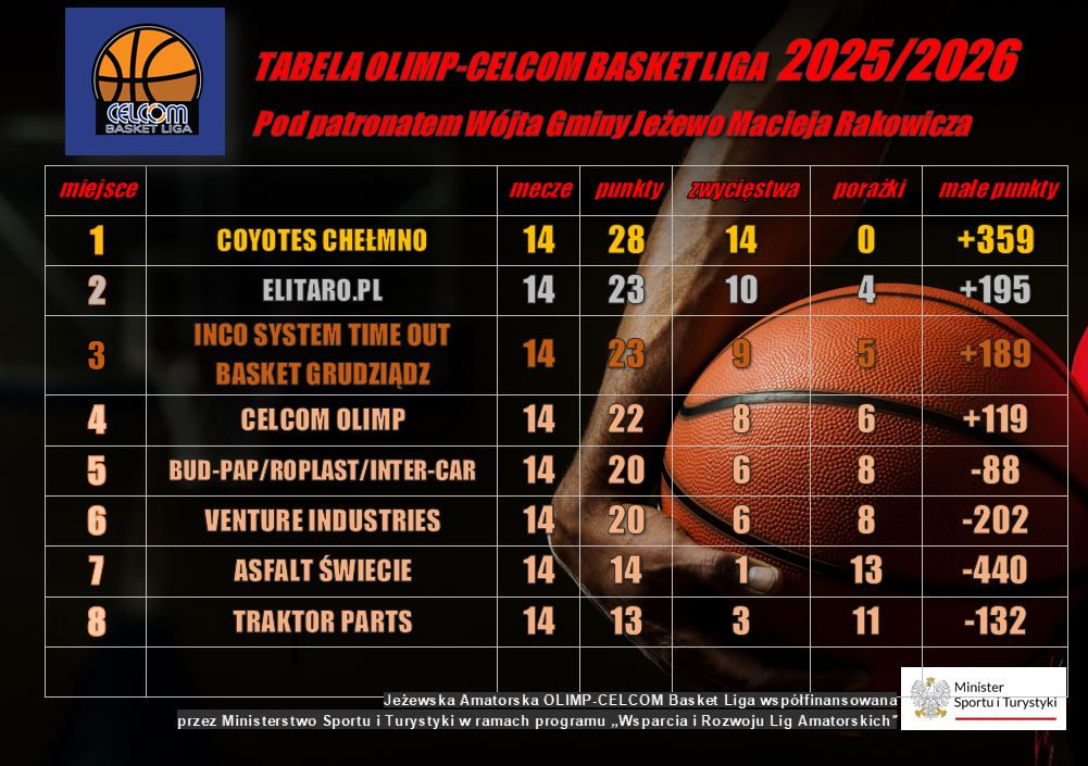 Coyotes Chełmno został mistrzem siódmego sezonu Olimp-Celcom Basket Ligi o Puchar Wójta Gminy Jeżewo Macieja Rakowicza. W tej edycji organizatorzy nie zaplanowali fazy play-off, jak w poprzednich latach. Zamiast niej będzie tylko turniej o Puchar Ligi. „Kojoci” w debiucie w jeżewskiej lidze odnieśli komplet 14 zwycięstw. Na koniec ograli dotychczasowego wicelidera Inco System Time Out Basket Grudziądz 77:52. Coyotes do wygranej poprowadzili Daniel Belski – 23 pkt i Patryk Brzóskowski – 22. Porażkę grudziądzan wykorzystał inny beniaminek Elitaro.pl Grudziądz, który zwyciężył ustępującego mistrza Venture Industries Grudziądz 78:57 i sezon zakończył na 2. miejscu. Elitaro.pl do wicemistrzostwa poprowadził Karol Klein – 19 pkt.