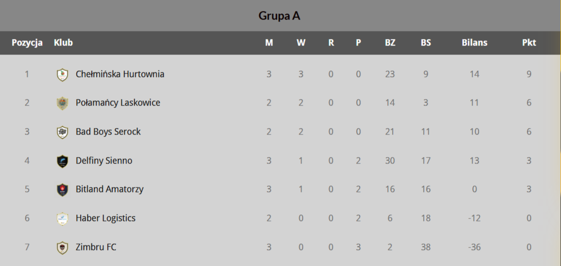 Grupa „A”: Zimbru FC – Delfiny Sienno 1:20 (0:8) - Roger Gomez (ZFC), Aleksander Witek 5, Jakub Dalecki 3, Antoni Chylewski 2, Hubert Gniot 2, Kacper Klepczyński 2, Jakub Cielepak 2, Sebastian Smaruj 2, Bartosz Stala, Arnoldo Amador (samobójcza – D); Bitland Amatorzy – Chełmińska Hurtownia Owoców i Warzyw 1:5 (1:2) - Mariusz Trepkowski (A); Karol Nicieja 3, Emil Nowak, Szymon Taczyński (H); Bad Boys Serock – Bitland Amatorzy 11:5 (3:3) - Jakub Jędrzejczyk 4, Marcin Włoch 2, Artur Polasik 2, Daniel Bandyszewski, Robert Czartowski, Castro Jefry Andres Gaitan (BB), Mariusz Trepkowski 2, Arkadiusz Kozłowski, Jacek Jantoń, Krzysztof Szymczak (A); Haber Logistics – Chełmińska Hurtownia Owoców i Warzyw 4:12 (4:6) - Roman Umanskyi 4 (HL), Jarosław Gaweł 4, Karol Nicieja 3, Dawid Rogulski 2, Wojciech Sondej, Emil Nowak, Sebastian Marchlewicz (H).