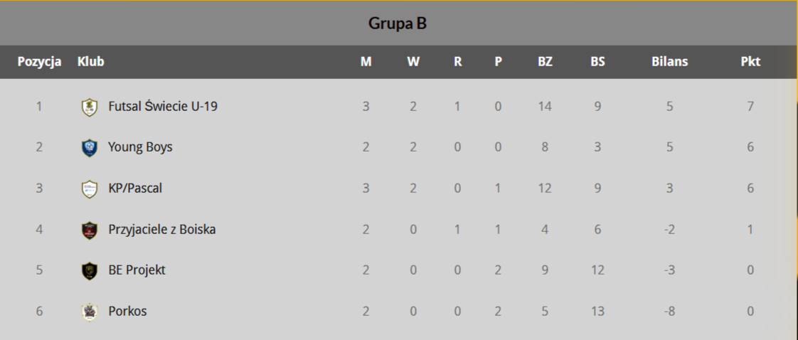 Grupa „B”: Przyjaciele z Boiska Bysław – Klub Podróżnika/Pascal 2:4 (1:2) - Patryk Krajna 2 (P), Tomasz Wrzeszczyński, Mateusz Szymecki, Marcin Gałusza, Arkadiusz Cybulski (samobójcza – KP); Porkos – Futsal Świecie U19 3:7 (2:5) - Emil Orłowski, Wiktor Chyliński, Jakub Wamka (samobójcza – P), Bartosz Kotras 3, Maciej Żurek, Oliwier Kasperski, Fabian Waszkowski, Mateusz Barański (FU19).