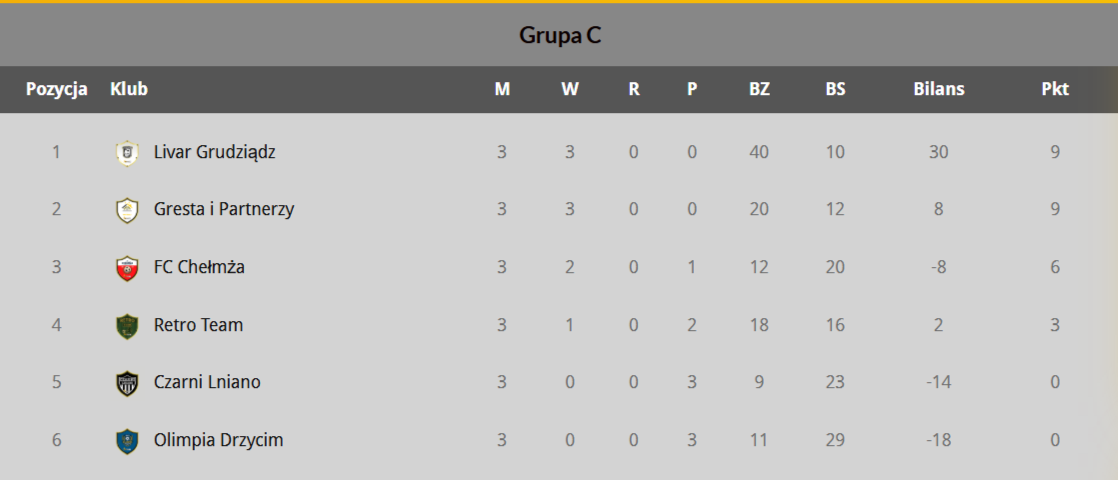 Grupa „C”: Retro Team – FC Chełmża 3:6 (3:1) - Damian Taglewski, Radosław Goral, Jakub Smolny (RT), Bartosz Wolak 3, Mateusz Kowalski, Dawid Kotlarz, Maciej Rzepkowski (FC); Livar Śródmieście Grudziądz – Czarni Lniano 14:4 (8:3) - Amadeusz Olszewski 7, Jakub Rulewski 2, Bartosz Krzak, Denis Rienkiewicz, Paweł Kobylański, Nikodem Cukrowski, Patryk Otlewski 1 (samobójcza – LŚ), Patryk Otlewski, Maciej Szefliński, Sebastian Giczela, Bartosz Krzak (Cz); Gresta i Przyjaciele – Olimpia Drzycim 8:4 (5:0) - Maciej Cerajewski 2, Mikołaj Topór 2, Michał Kolano, Jakub Łytkowski, Filip Ławicki, Dominik Zieliński (G), Xavier Diaz 3, Marcin Bojdo (O).