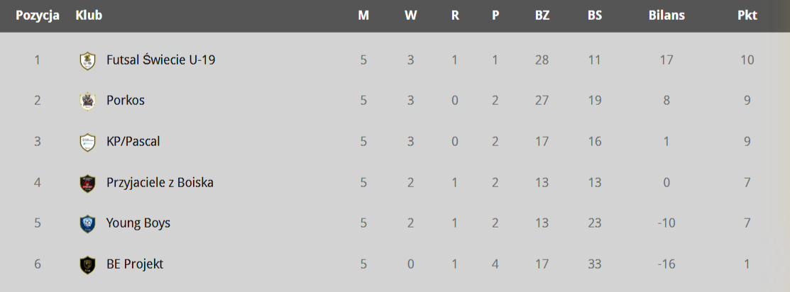 5. kolejka: Haber Team – Olimp Futsal Team 4:6 (1:2) - Krystian Belzyt 2, Adrian Wróblewski, Przemysław Modrzyński (HT), Paweł Zieliński 2, Mateusz Skowroński, Damian Fijałkowski, Karol Misiaszek, Wiktor Zacharek (OFT); Galport Świecie – Raf-Mix & Partnerzy 5:1 (0:1) - Bartosz Przypis, Wojciech Węgrzyn, Dawid Kawka, Kamil Domański, Kajetan Wojciechowski (G), Łukasz Cięgotura (RM).