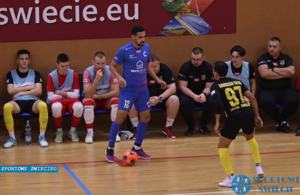 Futsal Świecie przegrał w 17. kolejce Fogo Futsal Ekstraklasy z Constractem Lubawa 3:8 (1:6). Lista nieobecnych u beniaminka była nadal długa. Co prawda, wrócił Davidson Silva, ale za to zabrakło Krzysztofa Elsnera (turniej w Katowicach z reprezentacją Polski socca) i trenera Marcina Mikołajewicza (wyjazd związany z pracą w wojsku). Drużynę prowadził Marcin Wanat. Poza tym ponownie nieobecni byli Mateusz Cyman, Oliver Zaręba, Maksymilian Lewandowski i Szymon Kocieniewski. Na domiar złego na początku spotkania urazu doznał Brazylijczyk Luiz Gustavo Przybyszeweski i nasz zespół grał w siódemką graczy. Zaczęło się obiecująco dla Panter, bo w 1. min. objęły prowadzenie. Z autu Tavo zagrał piłkę do Marcina Mrówczyńskiego, a ten „zawinął” obrońcę i oddał strzał. Piłka odbiła się od Matheusa Inacio i wpadła do siatki. Okazało się, że to były miłe złego początki. Wicemistrz Polski odpowiedział minutę później, a gola także po wznowieniu gry z boku boiska zdobył Adriano Lemos. Od tej pory goście zaczęli dominować i strzelać kolejne bramki. W 5. min. prowadzenie dał im Szymon Licznerski, któremu asystował Dawid Mataja. Cztery minuty potem na 3:1 trafił Kacper Sendlewski. Świecianie próbowali odpowiedzieć. Dwa razy groźnie uderzał z dystansu Mrówczyński, ale czujny był Roberto Gozi. Gospodarze zdecydowali się na grę z „lotnym bramkarzem”, ale ten manewr nie powiódł się. Po niecelnym strzale Karola Czyszka w 12. min. Gozi wznowił grę dalekim wyrzutem, a Chorwat David Mataja strącił piłkę klatą do pustej bramki. Po czterech minutach Constract zadał kolejny cios. Lubawianie dosłownie rozklepali naszą defensywę, a akcję sfinalizował Licznerski. Dwie minuty później Davidson Silva sfaulował w polu karnym Adriano Lemosa i sędzia wskazał na 6 metr. Rzut karny wykorzystał Szymon Licznerski kompletując hat-tricka. Wynik 1:6 utrzymał się do przerwy.