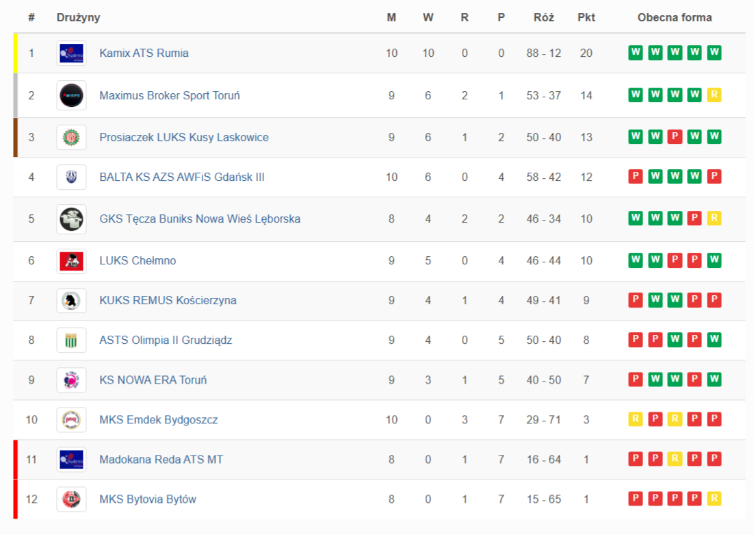 10. kolejka: Kamix ATS Rumia - MKS Emdek Bydgoszcz 10:0, Balta KS AZS AWFiS III Gdańsk - ASTS Olimpia II Grudziądz 4:6.