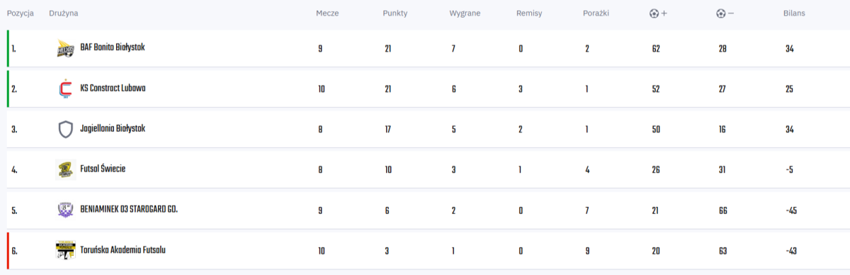 BAF Bonito Białystok wygrała w zaległym meczu 7. kolejki Centralnej Ligi Juniorów U19 z Futsalem Świecie 5:1 (2:0). Gospodarze tym zwycięstwem zapewnili sobie udział w Młodzieżowych Mistrzostwach Polski U19, które odbędą się w Mielcu. W 7. min. prowadzenie strzałem z bocznego sektora boiska dał im Paweł Popik. W 12. min. po rzucie rożnym na bramkę Panter strzelał Szymon Chyliński, a Kamil Boroda sprytnie zmienił lot piłki kierując ją do siatki. Wynik 2:0 utrzymał się do przerwy. Niestety, zaraz na początku 2. części Świecianie stracili trzeciego gola. Miejscowi dobrze rozegrali rzut wolny. Chyliński zagrał do Damiana Danilewicza, a ten z bliska wpakował piłkę do siatki. Podopieczni Davidsona Silvy próbowali odpowiedzieć. Danil Baliazin podłączał się często do akcji, ale brakowało dokładności, a strzały z reguły były niecelne. W 30. min. strata na środku boisku Szymona Taczyńskiego sprawiła, że w sytuacji sam na sam z bramkarzem gości znalazł się Szymon Chyliński, który do dwóch asyst dołożył gola. Bonito prowadziło już 4:0. W 34. min. bliski zdobycia bramki był Sebastian Marchlewicz, ale piłka trafiła tylko w słupek. Trzy minuty później Damian Danilewicz po przejęciu futsalówki na środku boiska popisał się indywidualną akcją, której przyglądali się biernie nasi piłkarze i strzałem z bliska pokonał Filipa Drażdżewskiego, który w międzyczasie pojawił się w bramce gości. W 39. min. za pociąganie za koszulkę Mateusza Barańskiego gospodarze zaliczyli szósty faul. Rzut karny przedłużony na honorową bramkę zamienił Kuba Wamka.