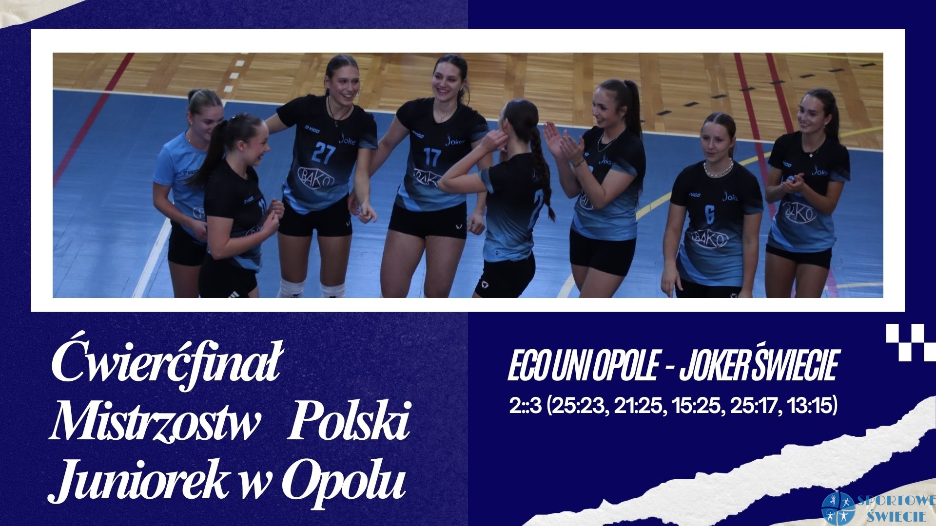 Jokerki zrobiły ważny krok, by z Opola wrócić z awansem. Na otwarcie rywalizacji w podgrupie „B” Eco Uni Opole przegrało z Jokerem Świecie 2:3 (25:23, 21:25, 15:25, 25:17, 13:15). Nasz zespół w końcu zagrał w optymalnym składzie z Martyną Topolińską na rozegraniu i Julią Figurą na przyjęciu. W pierwszym secie Jokerki prowadziły do 21:20, chwilami 4-5 punktami, ale w decydującym fragmencie dały sobie wyrwać wygraną. Za to w drugiej odsłonie było na odwrót. To Opolanki cały czas wygrywały, a zwrot akcji nastąpił od 18:16 dla nich, gdy podopieczne Miłosza Szwaby i Tomasza Szypera zdobyły pięć „oczek” z rzędu, a później odskoczyły na 23:19. Trzeci set to całkowita dominacja Jokera, zaś w czwartym rządziło Uni. O wszystkim zdecydował tie-break, w którym emocje sięgnęły zenitu. Świecianki prowadziły 4:2, by potem przegrywać 5:6 i 7:8. Następnie po zmianie stron wyszły na 10:8, ale rywalki odrobiły straty. Później było 10:10, 11:11, 12:12 i 13:13. W kluczowym momencie gospodynie zepsuły serwis, a pierwszego meczbola wykorzystała Julia Figura. Uni Opole oprócz Energetyka Poznań to chyba najgroźniejszy konkurent do awansu do półfinału Mistrzostw Polski Juniorek, dlatego dzisiejsze zwycięstwo może mieć istotne znaczenie w końcowym rozrachunku.