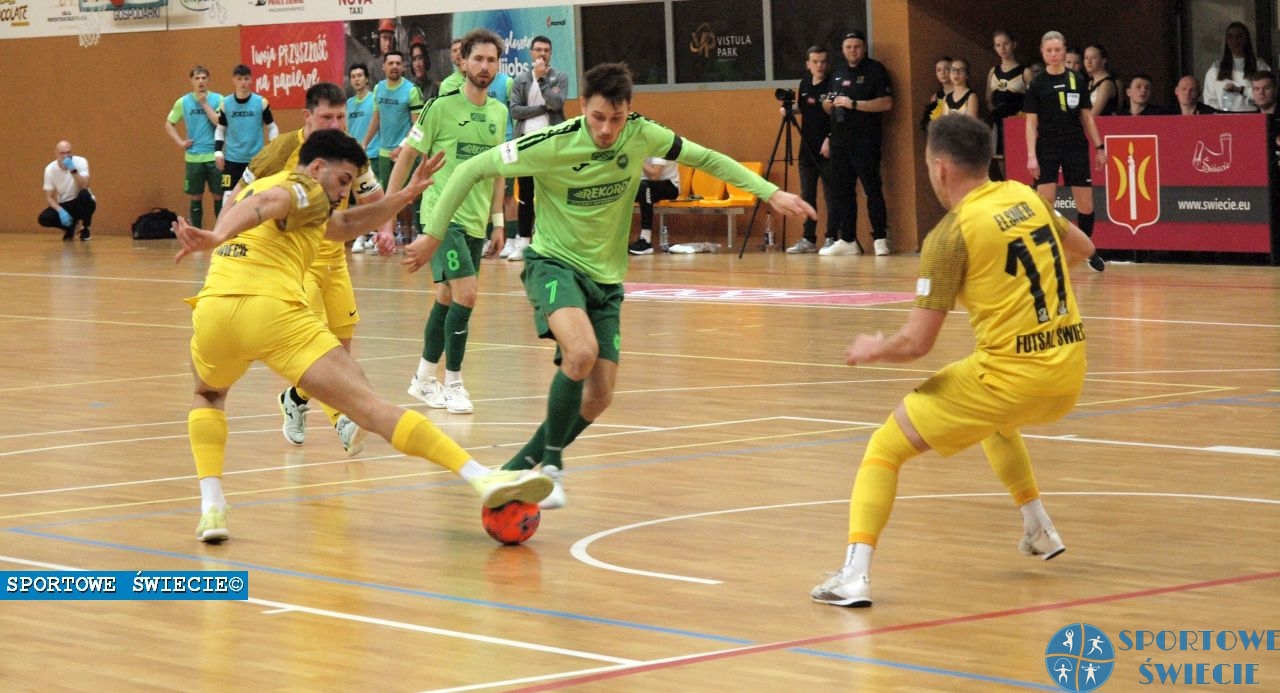 Futsal Świecie przegrał w 19. kolejce Fogo Futsal Ekstraklasy z Rekordem Bielsko-Biała 0:4 (0:0). W składzie gospodarzy zabrakło jedynie Marcina Mrówczyńskiego (pauza za kartki), który oglądał poczynania kolegów z trybun oraz Jakuba Wiśniewskiego. Od początku inicjatywa należała do gości, ale byli oni nieskuteczni. Dobrze bronił Bartosz Piotrowski, który miał też sporo szczęścia. W 2. min. pomógł mu Mikołaj Zastawnik, który pechowo głową zatrzymał piłkę po lobie Miguela Kenji. Z kolei w ostatniej minucie 1. części obramowanie bramki Futsalu obili Kacper Pawlus i Franco Spellanzon. Świeckie Pantery w 1. części oddały tylko 7 strzałów, w tym pięć celnych. Dwie szanse miał Mateusz Cyman, ale w pierwszej nie trafił w piłkę, zaś w 11. min. jego strzał sparował na aut bramkarz reprezentacji Polski Michał Kałuża. Próbowali też Karol Czyszek i Oliver Zaręba, ale golkiper był na posterunku.