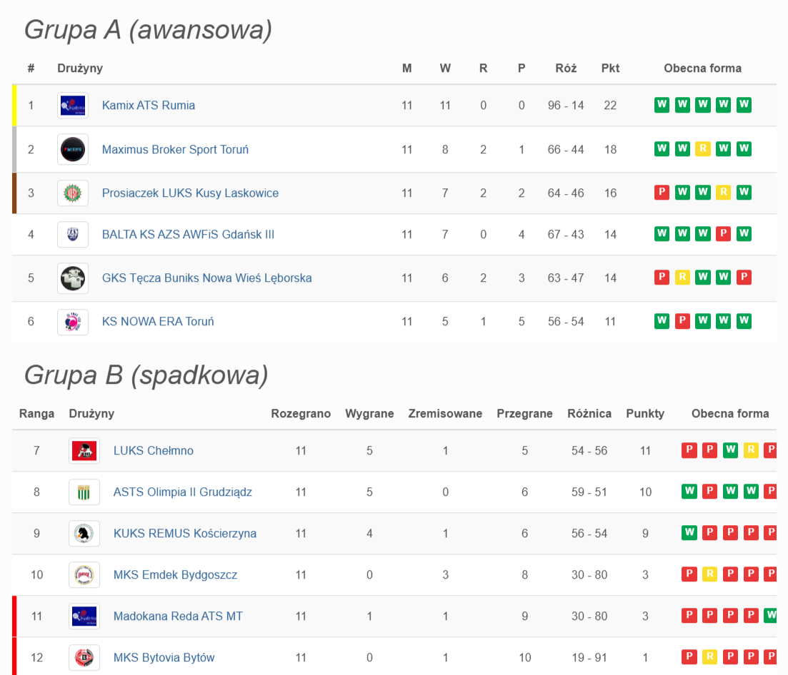 W drugim sobotnim meczu (zaległy z 11. kolejki) też nie było niespodzianki. Olimpia II Grudziądz przegrała z liderem Kamix ATS Rumia 2:8. Z tego wyniku najbardziej ucieszyli się zawodnicy KS Nowa Era Toruń, którzy utrzymali 6. miejsce i zagrają w grupie „mistrzowskiej”, a Grudziądzanie w „spadkowej”.