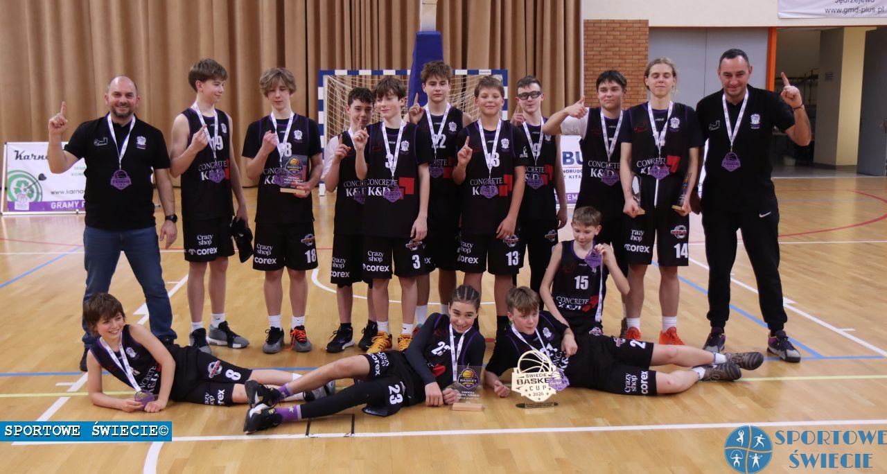 Kadeci młodsi ŚKK Świecie triumfowali w III Świecie Basket Cup, który wczoraj odbył się w hali widowiskowo-sportowej w Świeciu. Rywalizacja z udziałem czterech drużyn rozpoczęła się o godz. 9.30 i trwała do prawie 20. Gospodarze odnieśli trzy wysokie zwycięstwa. Pokonali kolejno: Twarde Pierniki Toruń 105:74 (35:21, 22:13, 20:18, 28:22), Maximusa Gdynia 121:38 (26:8, 40:13, 32:7, 23:10) i na koniec ŁKS Szkoła Gortata Łódź 112:66 (28:20, 25:21, 24:8, 35:17). Ostatni mecz to pojedynek czołowych dwóch zespołów w ligach wojewódzkich U14. ŁKS jest w swojej liderem. Do przerwy Świecianie prowadzili chwilami 18 „oczkami”, ale w ostatniej minucie zawodnicy z Łodzi zbliżyli się na 41:53. Jednak przez pierwsze sześć minut gospodarze pozbawili rywali szans na odrobienie strat uciekając na 73:43. Później jeszcze ten dystans powiększyli znacząco. W naszym zespole jak zawsze główne skrzypce grało trio Jakub Drzewiecki, Aleks Drążkowski i Kaj Rutkowski, ale dzielnie wspierali ich Igor Śliwiński czy Antoni Mróz. Inni zawodnicy też dołożyli cegiełkę do trzeciego już triumfu w Świecie Basket Cup. Trenerzy Karol Drzewiecki i Michał Ciesielski często rotowali składem, by wszyscy mogli pograć. Przypomnijmy, że dwa lata temu grano w kategorii U12, zaś 12 miesięcy temu w U13.