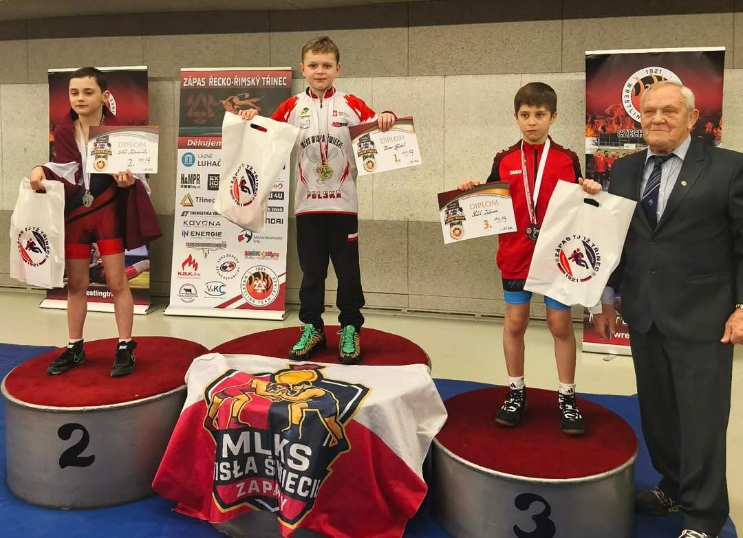 Pięć medali zdobyli reprezentanci Wisły Świecie w II Międzynarodowym Memoriale Jiřího Fraňka w zapasach, który w sobotę odbył się w czeskiej miejscowości Trzyniec. W turnieju rywalizowali młodzi zapaśnicy z Austrii, Czech, Polski, Izraela, Ukrainy, Węgier, Litwy, Słowacji, Łotwy i Hiszpanii. Nasz kraj poza Wisłą reprezentowali też kluby z Gogolina, Kędzierzyna-Koźle, Bydgoszczy i Krakowa. Rywalizowano w kategoriach U7, U9, U11 i U13 dziewcząt i chłopców. Do Trzyńca pojechało siedmioro Wiślaków, którymi opiekowali się trenerzy Rafał Kiełpiński i Maciej Przestrzelski. Dorobek Świecian to trzy złote krążki, jeden srebrny i jeden brązowy. Po złote medale sięgnęli Julian Hajne (U9 chłopców, 22 kg), Nikodem Flasiński (U9 chłopców, 28 kg) i Oliwier Gładek (U11 chłopców, 31 kg). Srebro z Czech przywiozła Luiza Browarczyk, która walczyła w 28 kg U11 dziewcząt przegrywając finał z zawodniczką z Węgier Kiarą Puber. Natomiast po brąz sięgnął Remigiusz Makowski w wadze 35 kg U9 chłopców.