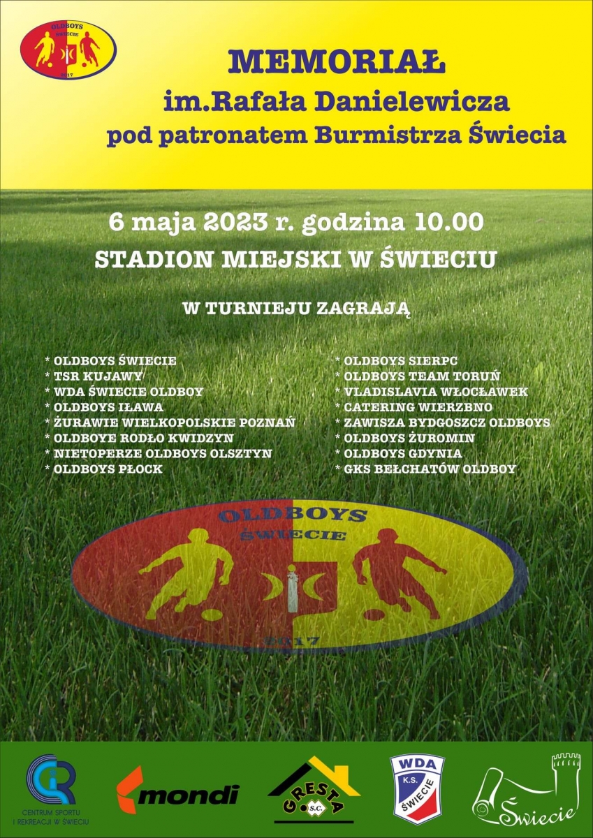 W sobotę na obiektach Wdy w Świeciu odbędzie się II Memoriał im. Rafała Danielewicza pod patronatem burmistrza Świecia Krzysztofa Kułakowskiego. W turnieju zagrają zawodnicy mający 35 i więcej lat. Udział w nim zapowiedziało aż 16 drużyn m.in. z Bełchatowa, Bydgoszczy, Poznania, Gdyni, Włocławka, Płocka, Iławy. Zagrają też dwie ekipy od nas tj. Oldboys Świecie i Wda Świecie Oldboys. Mecze rozgrywane będą na małych boiskach (6+1), przewidziane są cztery grupy.