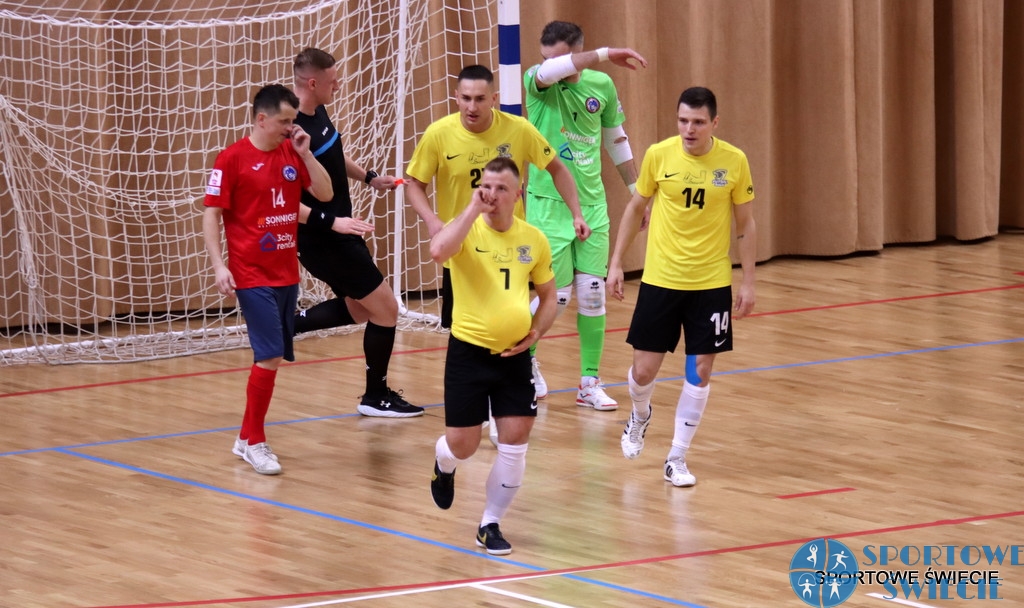 W meczu 15. kolejki I ligi PLF Futsal Świecie pokonał Dragona Bojano 8:6 (5:2). Dzięki wygranej beniaminek wrócił na 3. miejsce, które stracił po 1. rundzie po pechowym walkowerze za mecz w Szczecinie. Zaczęło się od gola dla gości w 2. min. z rzutu karnego, ale od razu wyrównał Piotr Kaczkowski. Później świecianie prowadzili trzykrotnie różnicą trzech bramek (4:1, 5:2, 6:3). Kluczem do sukcesu okazały się strzały z bocznych sektorów boiska, z którymi nie radził sobie golkiper „Smoka”. Jednak w ostatnich ośmiu minutach gospodarze omal nie roztrwonili przewagi. Nadmiar fauli sprawił, że zespół z Bojana miał dwa rzuty karne przedłużone. Te znakomicie wykonał Oskar Bohm i w 35. min. było tylko 6:5. Na szczęście beniaminek ma w swoich szeregach Piotra Kaczkowskiego, który 30 sekund później strzałem zza pola karnego zdobył siódmego gola dla Futsalu. Nerwowo było jednak do końca. W ostatniej minucie były jeszcze dwa rzuty karne przedłużone. Najpierw na 8:5 trafił z niego Karol Czyszek, a wynik ustalił Oskar Bohm, który okazał się doskonałym egzekutorem tego stałego fragmentu gry.