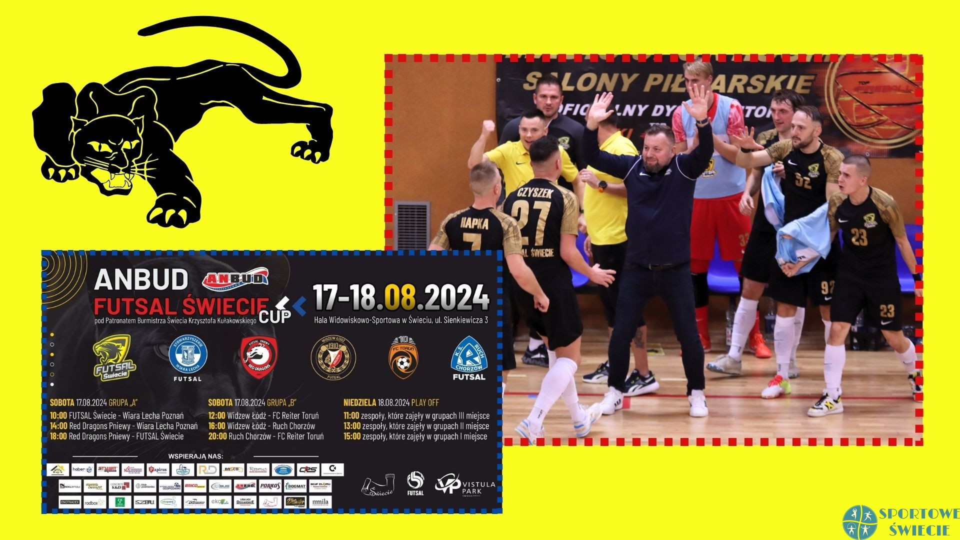 Nasz pierwszoligowiec po raz pierwszy organizuje turniej „Anbud Futsal Świecie Cup” pod patronatem burmistrza Krzysztofa Kułakowskiego. Jak już informowaliśmy na naszym portalu, weźmie w nim udział trzech przedstawicieli FOGO Futsal Ekstraklasa, dwaj pierwszoligowcy z grupy północnej i jeden z grupy południowej, notabene spadkowicz z elity. W wyniku losowania utworzono grupy eliminacyjne, w których rywalizacja będzie przez całą sobotę (sześć meczów). W grupie „A” zagrają Futsal Świecie, Wiara Lecha Poznań i Red Dragons Pniewy, zaś w „B” Widzew Łódź, Ruch Chorzów i FC Reiter Toruń. Rywalizacja ruszy w sobotę o godz. 10 pojedynkiem pierwszoligowców z grupy północnej Futsal Świecie – Wiara Lecha Poznań. Pantery będą miały okazję poznać beniaminka, który przygotowania do nowego sezonu zaczął znacznie później, bo 6 sierpnia. Poznaniacy dopiero w Świeciu będą mieli okazję zagrać pierwsze mecze kontrolne. W zespole z Wielkopolski po awansie zostało ośmiu piłkarzy. Do kadry dołączyło dziewięciu, w tym były reprezentant Polski i zawodnik Lecha Poznań Radosław Majewski. Drugie spotkanie pierwszoligowiec ze Świecia rozegra w sobotę o godz. 18 z „Czerwonymi Smokami” z Pniew, które w zeszłym sezonie zajęły 9. miejsce w ekstraklasie. Pozostałe mecze pierwszego dnia rozgrywane będą o godz. 12, 14, 16 i 20. Jedno spotkanie trwać będzie 2x 15 minut z zatrzymywanym czasem w przerwach w grze.
