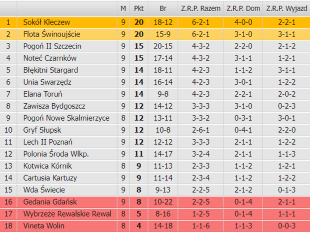 Wyniki 9. kolejki: Wda Świecie - Błękitni Stargard 2:1 (0:0) - Oskar Januszewski (52), Jay Jaskólski (60) - Mateusz Piotrowski (68); Wybrzeże Rewalskie Rewal - Elana Toruń 1:3 (0:1) -Maciej Rodzoch (84) - Jakub Stawski 2 (76, 83), Kamil Piskorski (45-karny); Vineta Wolin - Kotwica Kórnik 1:3 (0:2) - Marcin Gawron (55) - Krystian Pawlak (26), Adam Borucki (44), Filip Wełniak (85); Noteć Czarnków - Pogoń Nowe Skalmierzyce 0:4 (0:1) - Filip Szewczyk 3 (10-karny, 76, 90+2-karny), Patryk Palat (65); Gryf Słupsk - Gedania Gdańsk 1:1 (0:1) - Damian Wojda (51) - Igor Bogdański (45); Sokół Kleczew - Lech II Poznań 3:2 (0:1) - Mateusz Sopoćko 2 (57, 86), Michał Zimmer (68) - Igor Stankiewicz (32), Maksym Czekała (76); Unia Swarzędz - Flota Świnoujście 4:1 (2:0) - Krzysztof Biegański 2 (48, 65), Gracjan Goździk (15), Filip Tonder (44) - Bartosz Krzysztofek (56); Zawisza Bydgoszcz - Cartusia Kartuzy 4:1 (4:0) - Łukasz Szramowski (18), Patryk Mikita (24), Norbert Gaczkowski (31), Mateusz Młynarczyk (35) - Patryk Soboczyński (73); Polonia Środa Wielkopolska - Pogoń II Szczecin 1:3 (1:0) - Óscar Romero (45) - Mateusz Bąk (74), Adam Frączczak (85-karny), Kamil Rutowski (87).