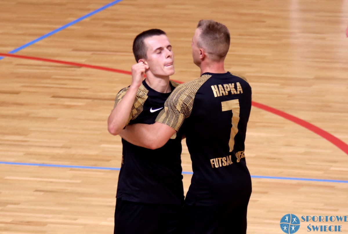 Na inaugurację sezonu 2023/24 I ligi PLF Futbalo Białystok zremisowało z Futsalem Świecie 1:1 (0:0). W składzie naszej drużyny znalazło się tylko czterech nowych zawodników, ale oficjalny debiut zaliczyło trzech: Maksymilian Lewandowski, Mateusz Cyman i Jakub Wiśniewski. Bramkarz Karol Drażdżewski całe spotkanie przesiedział na ławce, bo bardzo dobrze bronił Daniel Semrau. Do Białegostoku nie pojechał Marcin Mrówczyński. W 1. części inicjatywa należała do świecian, ale brakowało im skuteczności. Szanse mieli m.in. Jakub Hapka, Adam Kolamjer, Olaf Wójtowicz, Marcin Wanat, Piotr Kaczkowski, Maksymilian Lewandowski i Mateusz Cyman. Od początku świetnie bronił nowy bramkarz Futbalo Kamil Wójcik, który ostatnie trzy lata spędził w ekstraligowym AZS UW Wilanów. W 20. min. w sukurs przyszedł mu słupek po strzale Cymana. Gospodarze mieli dwie świetne okazje. W 8. min. Olaf Wójtowicz wybił piłkę z linii bramkowej po strzale Damiana Grabowskiego. Z kolei w 17. min. spudłował Bartosz Borowik. Po przerwie białostocczanie częściej próbowali zaskoczyć Daniela Semraua. W 28. min. po akcji indywidualnej prowadzenie dał im Jakub Konon. Mankamentem miejscowych były faule. W 1. połowie jeszcze im się upiekło, ale w drugiej już nie. W 33. min. goście mieli pierwszy rzut karny przedłużony, jednak strzał Karola Czyszka obronił Wójcik. Do remisu doprowadzić mogli też Kaczkowski i Szymon Kocieniewski. Na 90 sekund przed końcem trener Marcin Mikołajewicz zdecydował się na grę z „lotnym bramkarzem”. W tej roli wystąpił Maksymilian Lewandowski. Manewr szybko przyniósł efekt, a do remisu strzałem z dystansu w „okienko” doprowadził właśnie Lewandowski. Chwilę potem Futsal miał drugi rzut karny przedłużony. Niestety, Piotr Kaczkowski nie zdołał pokonać Kamila Wójcika, który wyrósł na bohatera tego spotkania. Podobnie jak 1 kwietnia w Świeciu obie ekipy podzieliły się punktami, choć wtedy było 2:2.
