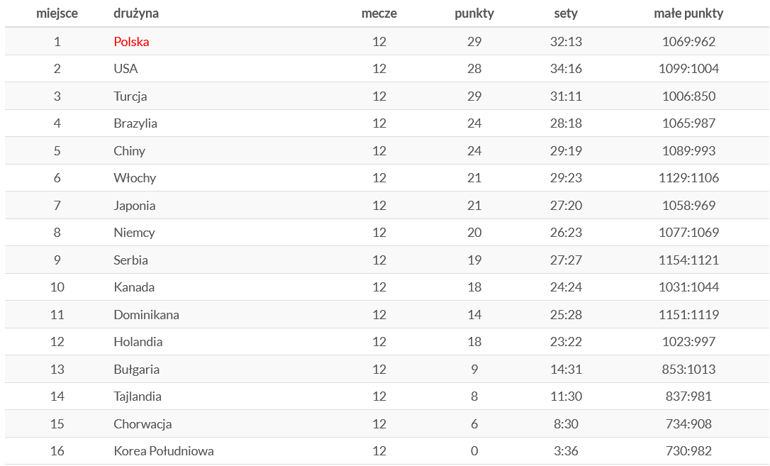 RANKING VNL KOBIET PO ELIMINACJACH (od punktów ważniejsza jest liczba zwycięstw):