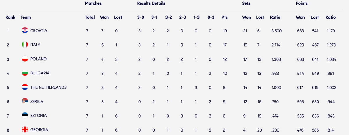 W grupie „A” najlepsza okazała się Chorwacja – 19 pkt, która wygrała wszystkie siedem meczów, a po punkcie urwały jej tylko Polki i Bułgarki. Drugie były Włochy – 17 pkt.