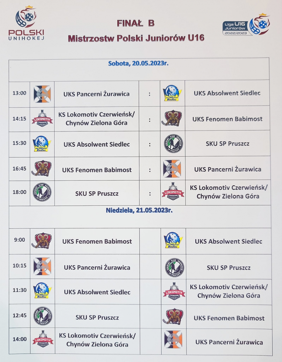 Tymczasem w Ojrzanowie odbędzie się finał „A” MP U-16, gdzie wyłoniony zostanie nowy mistrz kraju juniorów młodszych. Zagrają: ULKS Józefina, KS Gorący Potok Szarotka Nowy Targ, UKS Błyskawica Niechanowo/Salezjanie Poznań, Aligator UKS Chwarzno Gdynia, UKS Bankówka Zielonka i SKS Olimpia Łochów.