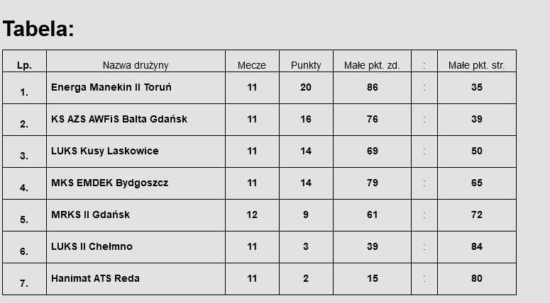 Inne wyniki – 12. kolejka: MRKS II Gdańsk - Energa Manekin II Toruń 0:8, LUKS II Chełmno - KS AZS AWFiSBalta Gdańsk 6:8. Pauza: Hanimat ATS Reda
