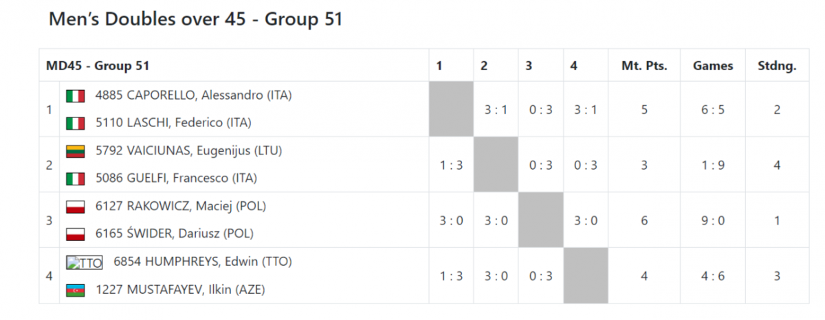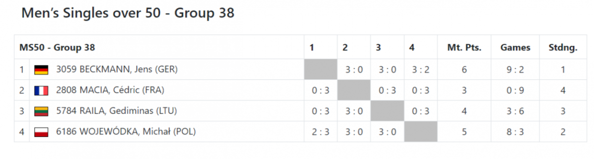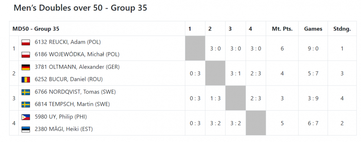 Michał Wojewódka gra w debla z Adamem Reuckim (Białystok). Polacy byli najlepsi w grupie 35. kategorii „Men’s Doubles over 50” wygrywając także wszystkie spotkania do zera. W tej kategorii było aż 75 grup. Na razie nie ma rozpisek debla w turnieju głównym.
