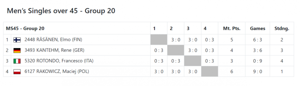 Maciej Rakowicz rywalizuje w kategorii 45-49 lat mężczyzn. We wtorek w grupie nr 20 wójt Jeżewa był bezkonkurencyjny nie tracąc nawet seta. Kolejno wygrał z Rene Kantehm (Niemcy) 3:0 (5, 5, 5), Francesco Rotondo (Włochy) 3:0 (1, 6, 5) i Elmo Räsänen (Finlandia) 3:0 (7, 8, 7). W 1. rundzie turnieju głównego Maciej Rakowicz miał wolny los. W drugiej w czwartek zmierzy się ze zwycięzcą pary Ivan Riggi (Włochy) – Andrej Bardon (Słowacja).