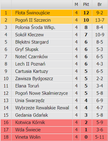 Wyniki 4. kolejki: Błękitni Stargard - Unia Swarzędz 0:1 (0:0) - Dominik Chromiński (57-karny); Polonia Środa Wielkopolska - Sokół Kleczew 4:1 (1:0) - Przemysław Koszel (20), Bartosz Bartkowiak (55), Filip Laskowski (62), Jakub Szczypek (79) - Adrian Kwiatkowski (88); Zawisza Bydgoszcz - Gryf Słupsk 0:0; Cartusia Kartuzy - Noteć Czarnków 1:1 (0:1) - Patryk Soboczyński (48) - Szymon Piekarski (24); Pogoń II Szczecin - Vineta Wolin 5:3 (1:1) - Adam Frączczak 2 (38-karny, 75), Kacper Gołębiewski 2 (60, 78), Maksymilian Bogusławski (83) - Marcin Gawron (24-karny), Kryspin Leśniak (51), Patryk Smykowski (73); Flota Świnoujście - Wybrzeże Rewalskie Rewal 1:0 (0:0) - Idris Momoh (53); Lech II Poznań - Wda Świecie 1:0 (0:0) - Maksym Czekała (90+4); Gedania Gdańsk - Elana Toruń 1:2 (0:0) - Marcin Adamik (61) - Kamil Woronecki 2 (69, 76); Pogoń Nowe Skalmierzyce - Kotwica Kórnik 1:1 (0:0) - Jakub Pawlik (81) - Krystian Pawlak (86).