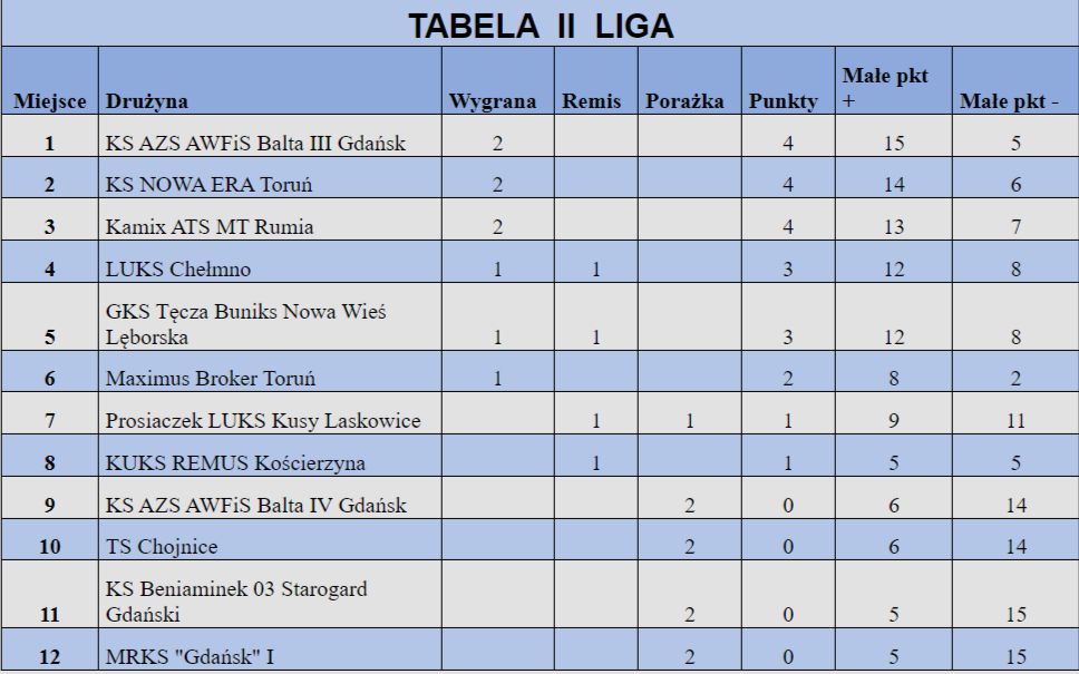 Inne wyniki 2. kolejki: KS AZS AWFiS Balta III Gdańsk - Beniaminek 03 Starogard Gdański 8:2, LUKS Chełmno - TS Chojnice 7:3, MRKS I Gdańsk - KS Nowa Era Toruń 3:7, GKS Tęcza Buniks Nowa Wieś Lęborska - KS AZS AWFiS Balta IV Gdańsk 7:3. Mecz Remus Kościerzyna - Maximus Broker Toruń przełożony na 18 października.