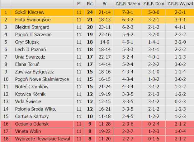 Wyniki 11. kolejki: Wybrzeże Rewalskie Rewal - Błękitni Stargard 0:1 (0:1) - Mateusz Piotrowski (2); Vineta Wolin - Wda Świecie 1:1 (0:0) - Miłosz Nowik (63) - Oskar Januszewski (90+7-karny); Noteć Czarnków - Elana Toruń 3:4 (1:0) - Szymon Piekarski 3 (37, 52, 83) - Kamil Woroniecki (46), Aleksander Kowalski (57), Kamil Kuropatwiński (65-karny), Miłosz Raniszewski (86); Gryf Słupsk - Kotwica Kórnik 3:1 (3:0) - Damian Mosiejko (17-karny), Mateusz Koniuszy (20), Dawid Więckowski (29) - Patryk Bordych (86); Sokół Kleczew - Pogoń Nowe Skalmierzyce 2:1 (0:0) - Filip Młodożeniec (64), Jan Paczyński (77) - Nikodem Ciupka (85); Unia Swarzędz - Gedania Gdańsk 5:0 (1:0) - Krzysztof Biegański (45), Dominik Chromiński (56), Gracjan Goździk (65), Tymoteusz Klupś (77-karny), Mateusz Maluśki (84); Polonia Środa Wielkopolska - Lech II Poznań 1:3 (0:1) - Óscar Romero (75) - Igor Kornobis (21), Igor Stankiewicz (70), Jakub Kendzia (81); Cartusia Kartuzy - Pogoń II Szczecin 0:0; Flota Świnoujście - Zawisza Bydgoszcz 2:3 (1:0) - Eryk Sobków (30), Bartosz Krzysztofek (64) - Patryk Mikita 2 (59-karny, 67-karny), Jakub Bojas (85).