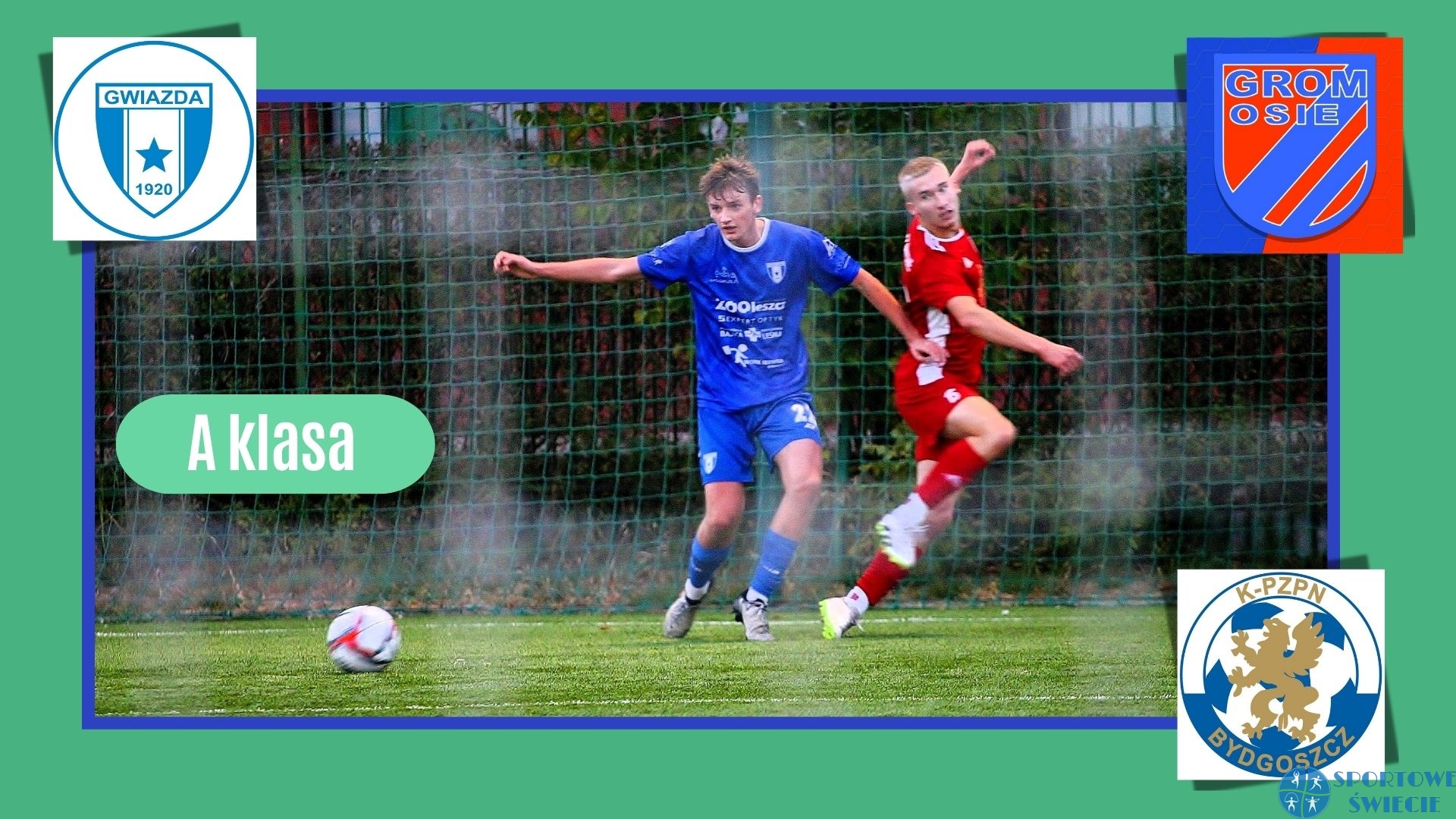 W meczu „sąsiadów z tabeli” Gwiazda Bydgoszcz wygrała z Gromem Osie 3:2 (0:0). Spotkanie rozegrano na boisku ze sztuczną murawą, a 2. połowę przy sztucznym oświetleniu. Można powiedzieć, że bydgoszczanie wyrwali gościom wygraną w tym meczu. Do 70. min. osianie prowadzili 2:0. Wynik w 52. min. otworzył Oskar Graczyk, a osiem minut później do siatki trafił Dominik Armatowski. Przy obu golach asystował Maciej Śliwiński. Piłkarze Gwiazdy nie pierwszy raz pokazali, że mają charakter i walczą do końca. W 70. min. kontaktową bramkę strzelił Jakub Śliwiński. Bohaterem zespołu z Bydgoszczy został Dominik Woźniak, którego dwie szarże przyniosły dwa gole na wagę trzech punktów. Najpierw w 83. min. przedarł się z prawej strony (patrząc od bramki Gromu) i z bliska pokonał Kacpra Siudę. Z kolei w 95. min. uciekł lewemu defensorowi rywali i z ostrego kąta podcinką przerzucił piłkę nad Siudą. Warto dodać, że Gwiazda na 23 pkt zdobyte w tym sezonie aż 14 ugrała w meczach z sześcioma A-klasowcami z powiatu świeckiego (4 wygrane, 2 remisy).