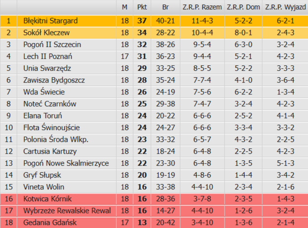Wyniki - 18. kolejka: Błękitni Stargard - Gedania Gdańsk 2:1 (1:1) - Oliwer Kowalik (29), Konrad Prawucki (49) - Maciej Gorwa (21); Lech II Poznań - Pogoń Nowe Skalmierzyce 4:1 (3:0) - Igor Stankiewicz 2 (7, 20), Igor Kornobis (11), Kamil Jakóbczyk (88) - Adam Majewski (67); Flota Świnoujście - Kotwica Kórnik 2:2 (1:0) - Patryk Harkot (25), Beniamin Wawrzonkiewicz (70) - Filip Wełniak (81), Radosław Jasiński (89); Pogoń II Szczecin - Elana Toruń 0:0; Cartusia Kartuzy - Wda Świecie 2:0 (2:0) - Ryszard Sumiński (25), Jakub Poręba (36); Zawisza Bydgoszcz - Wybrzeże Rewalskie Rewal 4:1 (1:0) - Jakub Bojas 2 (64, 68), Patryk Mikita (9-karny), Mateusz Młynarczyk (81) - Maciej Rodzoch (88); Polonia Środa Wielkopolska - Vineta Wolin 6:4 (2:3) - Jędrzej Drame 2 (38, 56), Piotr Skrobosiński (24), Damian Kołtański (42), Klaudiusz Milachowski (73), Bartosz Bartkowiak (81) - Jehor Sołomon (11), Oliwer Smuniewski (35), Wiktor Sawicki (45), Patryk Rychlik (85); Unia Swarzędz - Noteć Czarnków 2:3 (1:2) - Filip Tonder (45), Dominik Chromiński (90-karny) - Jakub Białczyk (26), Jakub Orwat (32), Hubert Szaufer (78), Sokół Kleczew - Gryf Słupsk 2:1 (0:1) - Adam Iwiński 2 (80, 87) - Michał Wiśniewski (38).