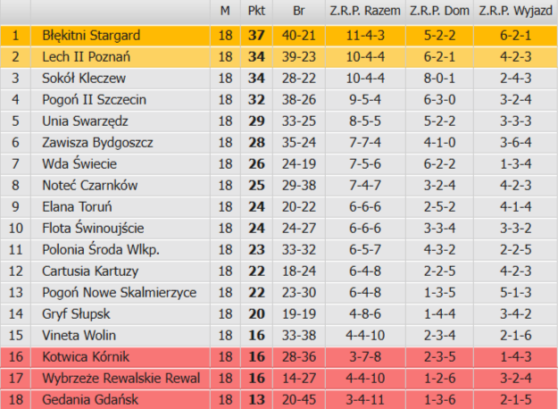 W zaległym meczu 17. kolejki III ligi Lech II Poznań pokonał Gedanię Gdańsk 3:0 (1:0). Już w 3. min. wynik otworzył Igor Kornobis, ale duży udział przy golu miał Filip Wilak, który zabrał przed polem karnym piłkę obrońcy, a potem wyłożył ją „na patelni” koledze. Kolejne bramki padły dopiero w samej końcówce. W 79. min. na 2:0 podwyższył strzałem z bliska Bartłomiej Juszczyk wykorzystując nieporozumienie stopera z bramkarzem. Cztery minuty potem po niepewnej interwencji golkipera Gedanii wynik ustalił Maksym Pietrzak. Dzięki wygranej rezerwy Lecha awansowały na 2. miejsce w tabeli spychając z niego Sokoła Kleczew. Do lidera Błękitnych Stargard oba te zespoły tracą po trzy „oczka”. Gedania tegoroczne granie kończy jako najsłabsza ekipa grupy 2.