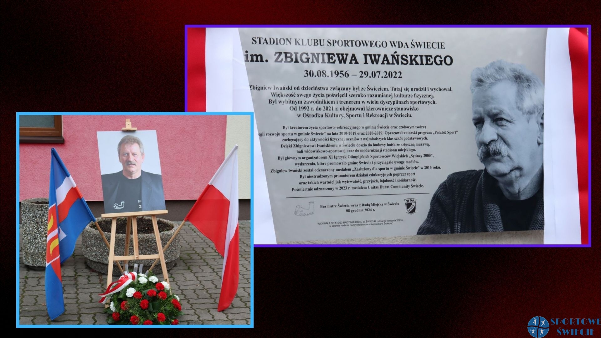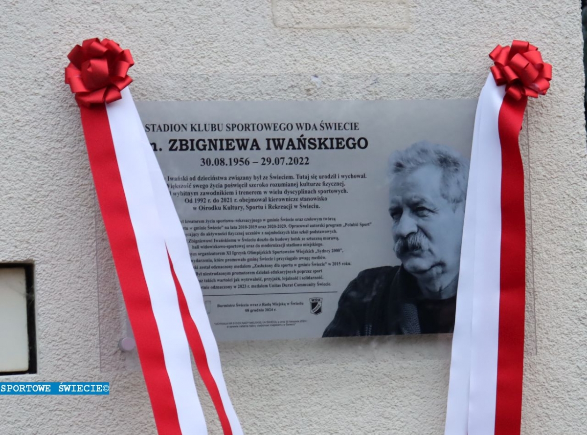 Dzisiaj rano na stadionie w Świeciu odsłonięto Tablicę Pamiątkową Zbigniewa Iwańskiego, byłego kierownika działu sportowego OKSiR-u w Świeciu, wielkiego promotora sportu w gminie. Tablica upamiętnia jego imię, ale także uchwałę z dnia 30 listopada 2023 r. Rady Miejskiej w Świeciu o nadaniu nazwy stadionowi w Świeciu im. Zbigniewa Iwańskiego. W uroczystości wzięła udział najbliższa rodzina oraz przedstawiciele władz samorządowych, Centrum Sportu i Rekreacji w Świeciu oraz przyjaciele zmarłego 29 lipca 2022 roku „ministra świeckiego sportu”. Tablicę poświęcił ksiądz Waldemar Wenta, proboszcz parafii pw. Chrystusa Króla w Świeciu.