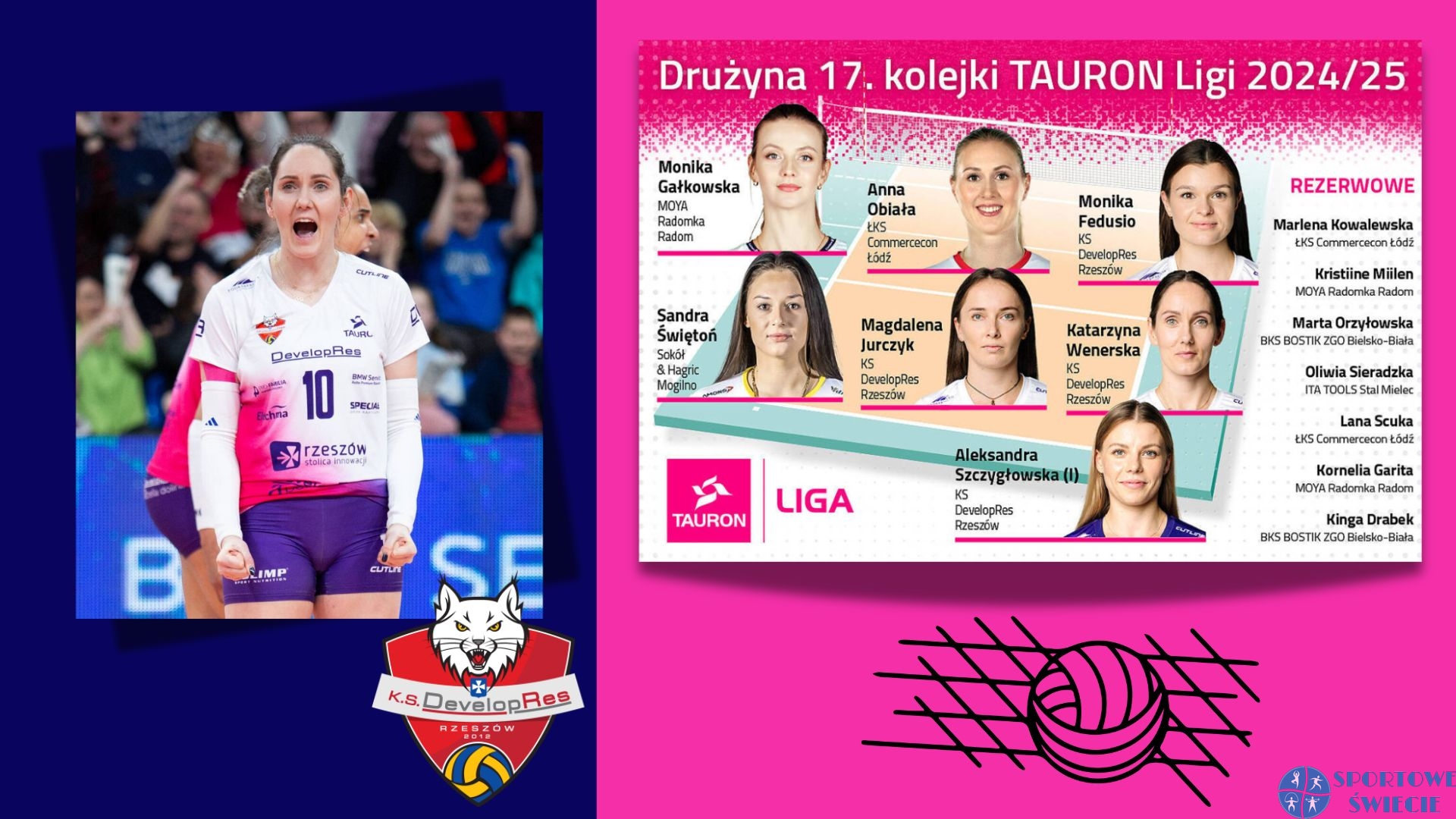 Świecianka Katarzyna Wenerska po raz dziewiąty w tym sezonie została wybrana do „drużyny kolejki Tauron Ligi”. Tym razem do tej opatrzonej nr 17. Zdaniem oficjalnego portalu rozgrywek rozgrywająca DevelopResu Rzeszów zasłużyła na miano „jedynki” na swojej pozycji. Wychowanka Jokera Świecie w tej kolejce poprowadziła Rysice do zwycięstwa w meczu na szczycie tabeli z PGE Grot Budowlani Łódź 3:1 (23:25, 26:24, 25:21, 25:16). Dzięki tej victorii zespół z Rzeszowa umocnił się na pozycji lidera. Katarzyna Wenerska oczywiście wyszła w podstawowej „6” i ani na moment nie opuściła boiska. Zdobyła dwa punkty zagrywką. W sumie w polu serwisowym pojawiła się 16 razy nie popełniając żadnego błędu. Statystyk zapisał na jej konto także 49 asyst, 13 obron i 3 wybloki. „Katarzyna Wenerska znakomicie poprowadziła grę zespołu w meczu na szczycie. Oprócz tego świetnie serwowała (2 asy i zero błędów) i broniła (13)” – tak argumentował wybór olimpijki ze Świecia portal www.tauronliga.pl.