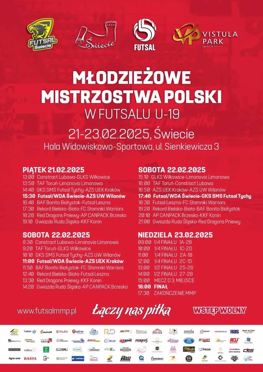 Mistrzostwa rozpoczną się jutro o godz. 13. Tego dnia każdy zespół zagra jedno spotkanie, czyli będzie osiem meczów. W sobotę zmagania potrwają od godz. 8.30, a zakończą przed 22. Tego dnia rozegrane zostaną dwie pełne kolejki (16 meczów). Natomiast w niedzielę faza play-off ruszy o godz. 9. Najpierw będą cztery spotkania ćwierćfinałowe (godz. 9, 10, 11, 12), a następnie dwa półfinałowe (godz. 13, 14), mecz o 3. miejsce (godz. 15) i finał (godz. 16). Zakończenie przewidziane jest ok. godz. 17.30. Szczegółowy plan gier znajdziecie na plakacie. Wszystkie mecze transmitowane będą na kanale ,,Łączy Nas Piłka TV". KLIKNIJ Dodajmy, że ewentualnym ćwierćfinale Futsal/Wda Świecie może trafić na zespół z grupy „A” i zagrać o godz. 9 lub 10.